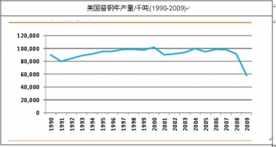 經(jīng)歷過70年代的衰退,80年代的痛苦轉(zhuǎn)型后,美國鋼鐵終于在90年代后進入了一段相對平穩(wěn)的恢復(fù)和發(fā)展時期,受國家政策扶植,出現(xiàn)了鋼鐵業(yè)衰而不退的現(xiàn)象,進入21世紀(jì),美國鋼鐵業(yè)受進口大增沖擊很大,政府不得不出面干預(yù),布什政府宣布并實行了201條款,限制鋼鐵進口并征高額關(guān)稅,美國鋼鐵業(yè)得以喘息,直至現(xiàn)在美國鋼鐵進口依然實行出口配額申請制度,保護本國產(chǎn)業(yè)。電爐和小型鋼廠的大范圍推廣和應(yīng)用極大的減少了鋼鐵的運輸成本,至2008年,美國電爐的產(chǎn)鋼量占鋼鐵總產(chǎn)量的58%。