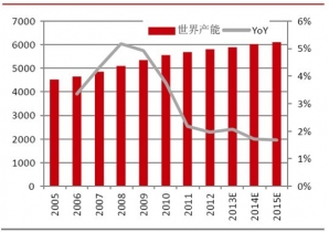 2005-2015年全球純苯產(chǎn)能統(tǒng)計(jì)及預(yù)測(cè):萬噸