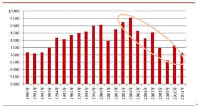 目前,美國(guó)的這種乙烯原料輕質(zhì)化的過程還在繼續(xù),與美國(guó)的裂解汽油路線純苯產(chǎn)量占比還將進(jìn)一步下降。按照美國(guó)乙烯產(chǎn)量保持不變,石腦油為原料的乙烯裂解占比繼續(xù)下降到10%和5%計(jì)算,裂解汽油路線的純苯產(chǎn)量將進(jìn)一步下降約47萬噸和78萬噸,預(yù)計(jì)到2015年美國(guó)的純苯凈進(jìn)口量將增長(zhǎng)至150萬噸。