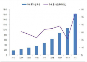 2003-2011年年末累計(jì)擔(dān)保額及其增速(億元)
