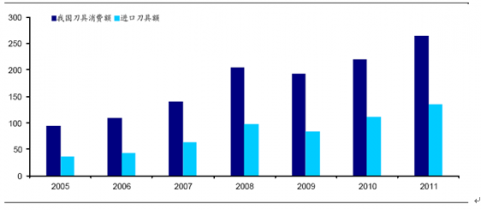 刀具為硬質(zhì)合金的深加工產(chǎn)品,從近年進(jìn)口額與消費(fèi)額看,我國刀具大部分依靠進(jìn)口。
