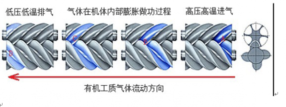 螺桿膨脹機的工作周期是由齒間容積中的吸氣、膨脹和排氣三個過程組成。