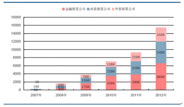 二十世紀(jì)八十年代,我國引入融資租賃。在經(jīng)歷初創(chuàng)、迅猛發(fā)展、清理整頓后,我國融資租賃業(yè)逐漸走向規(guī)范、健康發(fā)展的軌道。2007年3月,新修訂的《金融租賃公司管理辦法》開始實施,允許合格金融機構(gòu)參股或設(shè)立金融租賃公司。隨后,中國工商銀行、中國建設(shè)銀行、交通銀行、民生銀行和招商銀行等5家銀行分別設(shè)立金融租賃公司。隨著商業(yè)銀行進(jìn)入融資租賃業(yè),我國融資租賃業(yè)進(jìn)入了高速發(fā)展階段。2012年底,全國注冊運營的融資租賃公司由2007年的93家增長到約560家,其中包括金融租賃公司20家,內(nèi)資租賃公司80家,及外資租賃公司約460家;注冊資金總額達(dá)人民幣1820億元;租賃合同余額約15500億元,比2007年240億元的總量增長63.58倍,年均增速高達(dá)10.6倍。
