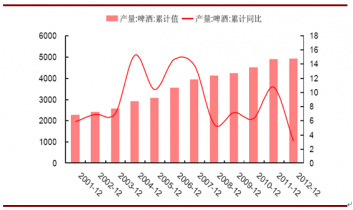 2001-2012年啤酒行業(yè)產(chǎn)量及增速:萬千升