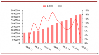 2001-2012年啤酒行業(yè)毛利潤(rùn)及增速:萬元