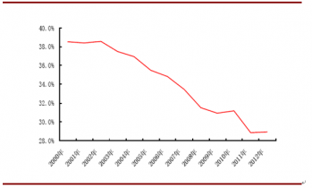 2012年行業(yè)營(yíng)業(yè)成本為1073億元,同比增長(zhǎng)8%,高于收入增速。根據(jù)已公布的啤酒企業(yè)年報(bào),2012年原材料、人工、能源等成本上升較快,侵蝕了企業(yè)利潤(rùn)。據(jù)統(tǒng)計(jì),啤酒行業(yè)2001年毛利率為38.5%,雖然這幾年啤酒終端價(jià)格不斷提升,產(chǎn)品結(jié)構(gòu)也持續(xù)升級(jí),但依然抵抗不住下游人工、能源以及固定資產(chǎn)損失等成本的大幅增加,導(dǎo)致2012年毛利率僅為28.9%,大約以每年1個(gè)百分點(diǎn)的速度下降,極大的侵蝕了啤酒行業(yè)的利潤(rùn)。