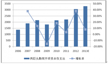 一、中石油中石化上游勘探開發(fā)投資躍上每年3000億規(guī)?碧介_發(fā)投資方面,仍然是以中石油、中石化、中海油三大油企為主,由于石油和天然氣的勘探開采比較密切,因此二者的投資也不能完全分開。我們計(jì)算了2006年以來中石油和中石化兩家公司的勘探開采投資,目前已經(jīng)達(dá)到了每年3000億的水平。2009年受金融危機(jī)和油價(jià)大跌的影響,當(dāng)年投資額有所下降,但2010年馬上就恢復(fù)增長(zhǎng)。并在2012年從之前2000億的水平躍上了3000億的水平。我們認(rèn)為在油價(jià)不出現(xiàn)大幅波動(dòng)的情況下,未來上游勘探開發(fā)投資額有望保持8%-10%左右的增長(zhǎng)速度。