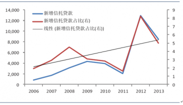 8號文涉及的社會融資主要是三類,即信托貸款、委托貸款和未貼現(xiàn)銀行承兌匯票,這三類融資方式新增額在2011年總共為2.5萬億,占社會融資總量的19.7%,而2012年為3.6萬億,占比為23%。我們認為,未貼現(xiàn)銀行承兌匯票是銀行的授信,故受到8號文的政策影響較小,2011年和2012年已經(jīng)明顯下降,預計2013年將保持穩(wěn)定,甚至略有回升;由于委托貸款近年來平穩(wěn)增長,平均每年增加2000億左右,并沒有出現(xiàn)脫離經(jīng)濟發(fā)展的變化,受本次政策的影響不大;而信托貸款是本次調控的重點,由于銀信合作導致了信托的爆發(fā)式增長,如果規(guī)范銀行的投資范圍,那么信托將首當其沖。