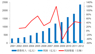 2002-2012年中國(guó)農(nóng)藥銷(xiāo)售收入及利潤(rùn)