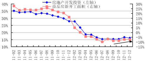 2011年2月~2012年12月房地產(chǎn)開發(fā)投資及新開工面積累計增速