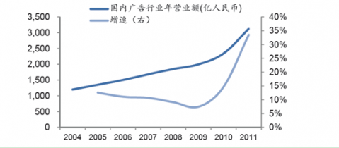 2004-2011年中國(guó)廣告行業(yè)營(yíng)業(yè)額及增速統(tǒng)計(jì)
