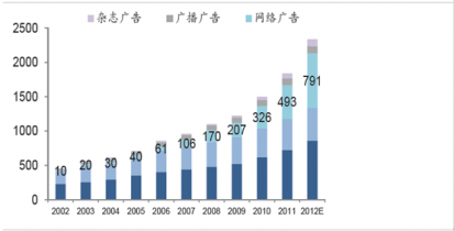 2002-2011年中國(guó)網(wǎng)絡(luò)廣告收入持續(xù)增長(zhǎng)
