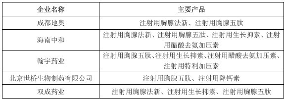 過(guò)去,我國(guó)的化學(xué)合成多肽藥物市場(chǎng)幾乎是國(guó)外品牌一統(tǒng)天下,近年來(lái),隨著我國(guó)一批化學(xué)合成多肽醫(yī)藥企業(yè)的快速崛起,以成都地奧、海南中和、翰宇藥業(yè)、北京世橋生物制藥有限公司及發(fā)行人等為代表的少數(shù)幾家具有大規(guī)模生產(chǎn)能力的醫(yī)藥企業(yè)開(kāi)始嶄露頭角。我國(guó)主要的化學(xué)合成多肽藥物生產(chǎn)企業(yè)和主要產(chǎn)品如下表所示: