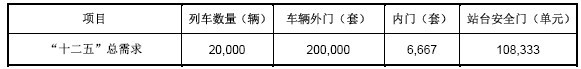 綜合考慮,按照每輛車廂需配10套外門測(cè)算;站臺(tái)安全門的市場(chǎng)需求按照“十二五”期間新增里程2,500公里、每1.5公里設(shè)1個(gè)站臺(tái)、每個(gè)站臺(tái)安裝50單元的安全門測(cè)算,同時(shí)考慮既有線路每年加裝100個(gè)站臺(tái),“十二五”期間我國(guó)城軌市場(chǎng)軌道交通門系統(tǒng)產(chǎn)品的需求如下表所示: