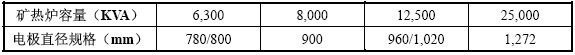 一般而言,礦熱爐容量與導(dǎo)電電極直徑規(guī)格配比關(guān)系如下: