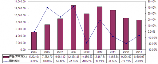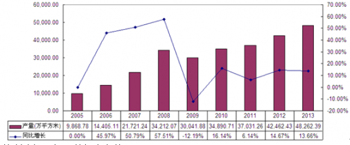 2005-2013年我國復(fù)合木地板行業(yè)產(chǎn)量統(tǒng)計