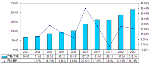 2004-2013年我國錦綸纖維行業(yè)產(chǎn)量統(tǒng)計(jì)分析