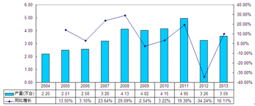 2004-2013年我國棉花加工機械行業(yè)產(chǎn)量統(tǒng)計分析