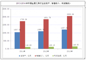 2014年1-12月全國規模以上金屬工具行業企業數量為1673家,金屬工具制造行業資產合計1207.53億元;實現銷售收入2055.06億元;完成利潤總額146.05億元。