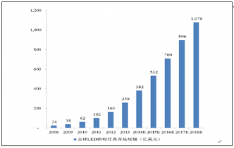隨著全球能源危機的加劇、居民環保意識的增強以及LED 照明技術進步和成本下降,LED 照明行業發展迅速,市場前景廣闊。根據預測,全球LED 照明燈具市場規模將由2013 年的約259 億美元增長到2018年的約1,078 億美元,2013-2018 年復合增長率達33.00%。