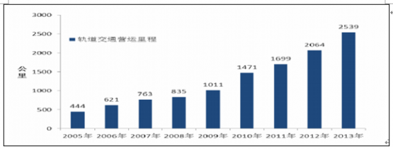 2005-2013 年中國軌道交通運營里程增長情況如下: