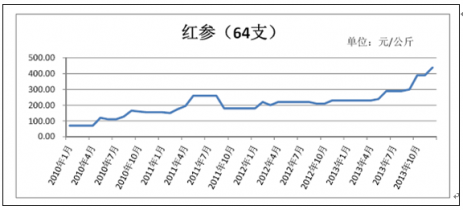 自2009年開始,市場情況開始好轉,加上2010年吉林省出臺了《吉林省人民政府關于振興人參產業的意見》,有實力的大型醫藥企業如修正集團、康美藥業、益盛藥業等紛紛涉足人參行業,導致了人參采購市場競爭日趨激烈,人參采購價格也逐年提高,自2009年以來人參、西洋參價格漲幅比較明顯,2014年紅參價格漲幅表現更為突出。
