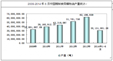 國(guó)家統(tǒng)計(jì)局?jǐn)?shù)據(jù)顯示:2014年6月全國(guó)精制食用植物油產(chǎn)量為5,969,718.27噸,同比增長(zhǎng)-5.83%,2014年1-6月全國(guó)精制食用植物油產(chǎn)量為30,151,801.26噸,同比增長(zhǎng)6.69%。