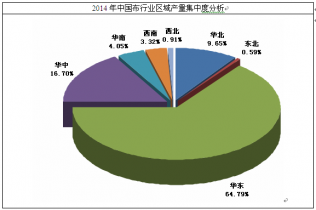 我國布行業(yè)產(chǎn)量區(qū)域集中度非常高,據(jù)2014年統(tǒng)計數(shù)據(jù)顯示,我國布產(chǎn)量主要集中在華東、華中地區(qū),產(chǎn)量分別占同期全國總產(chǎn)量的64.8%、16.7%。