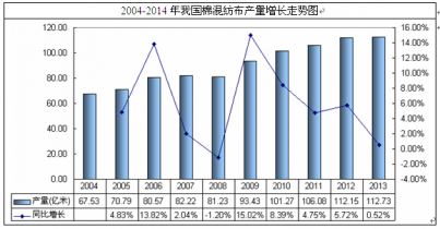 棉混紡布是指采用棉纖維和其它一種或兩種以上不同種類纖維混紡成紗線織成的布,主要有棉錦、錦棉、滌棉三類。統(tǒng)計(jì)數(shù)據(jù)顯示:2014年1-12月,我國累計(jì)生產(chǎn)棉混紡布112.73億米,與2014年同期相比增長0.52%。
