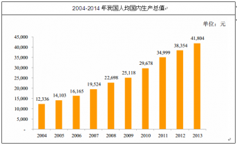 2004 年我國人均國內(nèi)生產(chǎn)總值為12,336 元,2014年已達(dá)到 41,804 元,過去十年間我國人均國內(nèi)生產(chǎn)總值呈現(xiàn)穩(wěn)定、快速的增長勢(shì)頭。