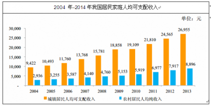 隨著我國經(jīng)濟(jì)的飛速發(fā)展,我國居民家庭人均可支配收入也呈現(xiàn)出快速增長的趨勢(shì)。2004 年我國城鎮(zhèn)居民家庭人均可支配收入為 9,422 元,到 2014年增加至26,955元。2004年農(nóng)村居民家庭人均純收入為2,936元,到2014年增加至8,896元。