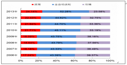 2013-2014年,滾筒、全自動波輪及雙桶波輪式洗衣機市場份額變化情況如下