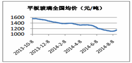 2013-2014年平板玻璃全國均價走勢圖(單元:元/噸)