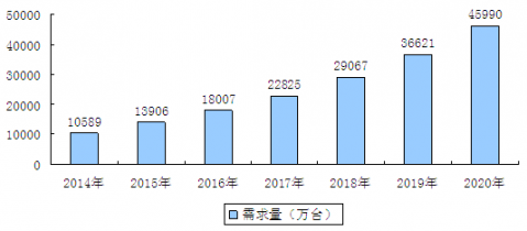 近幾年我國路由器市場需求量呈現(xiàn)逐年上升的趨勢。相關(guān)應(yīng)用技術(shù)的發(fā)展都對(duì)路由器應(yīng)用領(lǐng)域的進(jìn)一步拓寬起到了積極作用,極大地帶動(dòng)了路由器市場需求量的增加。2014年我國路由器行業(yè)需求量達(dá)到10589萬臺(tái),預(yù)計(jì)到2020年我國路由器行業(yè)需求量將達(dá)到45990萬臺(tái)。