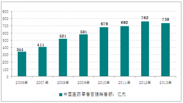 2006-2013年中國(guó)醫(yī)藥零售連鎖行業(yè)百?gòu)?qiáng)企業(yè)銷(xiāo)售收入:億元