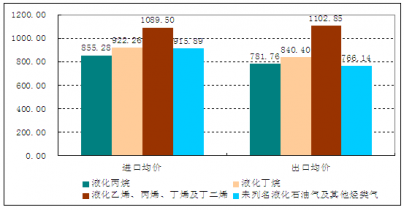 2013年全球液化石油氣細(xì)分產(chǎn)品進(jìn)出口均價(jià)對(duì)比圖:美元/噸