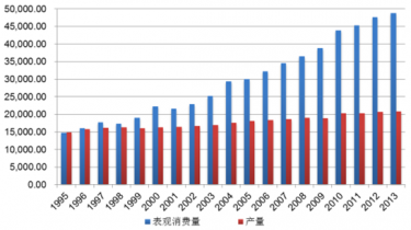 年份 | 產(chǎn)量(萬(wàn)噸) | 銷量(萬(wàn)噸) | 進(jìn)口(萬(wàn)噸) | 出口(萬(wàn)噸) |