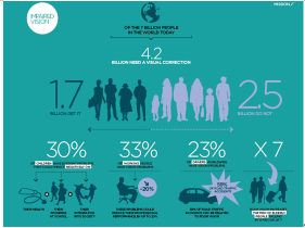 根據(jù)法國知名眼鏡制造商Essilor 發(fā)布的數(shù)據(jù)顯示,在全球70億人口中有42億人口存在視力問題,當中17億人口得到過視力矯正,但仍有高達25億人口無法獲得視力矯正。
