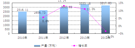 自2010年以來(除了2014年),中國尿素(折含N100%)產量整體保持穩步增長的態勢,產量均高于2500萬噸。2012年尿素增長率一度達到13.1%的高位,產量也是自2010年來首次突破3000萬噸,達到3003.83萬噸。以后的兩年尿素產量增長率一直處于下滑的態勢,到了2014年,出現了近五年來的首次負增長,與2013年3333.18相比,減產了超100萬噸,為3217.83萬噸。