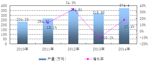 自2010年以來(除了2013年),中國化學農藥原藥(折有效成分100%)產量整體保持穩步增長的態勢,產量均高于200萬噸。但我國農藥產量的增長率波動較大,每年交替增減,2012年和2014年增長率上漲得較快,分別為34%和17.4%;2013年與2014年相比增長率下滑巨大,有2012年的34%下滑至2013年的-10.1,而且還是五年來的首次負增長。2014年乙烯產量增長率上漲了,產量達到近五年來的最高值達到374.40萬噸。
