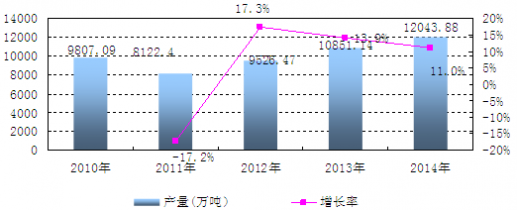 2014年中國磷礦石產量(折含五氧化二磷30%)達12043.88萬噸,比2013年同期增長了11%。