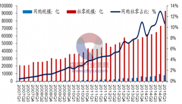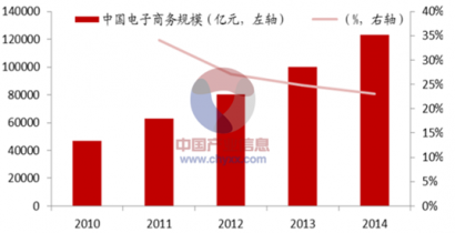 2014 年中國電子商務市場交易整體規模達到 12.3 萬億元,同比增長 21.3%。 其中,網絡購物所占份額為 23%,交易規模為 2.8 萬億,同比增長 48.7%,在社會零售總額中的滲透率首次突破 10%。中國已成為交易額超過美國的全球最大網絡零售市場,網絡購物也成為推動中國電子商務市場發展的重要力量。
