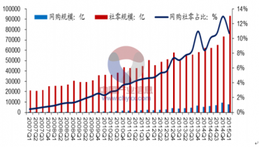 2014 年中國(guó)電子商務(wù)市場(chǎng)交易整體規(guī)模達(dá)到 12.3 萬億元,同比增長(zhǎng) 21.3%。 其中,網(wǎng)絡(luò)購(gòu)物所占份額為 23%,交易規(guī)模為 2.8 萬億,同比增長(zhǎng) 48.7%,在社會(huì)零售總額中的滲透率首次突破 10%。中國(guó)已成為交易額超過美國(guó)的全球最大網(wǎng)絡(luò)零售市場(chǎng),網(wǎng)絡(luò)購(gòu)物也成為推動(dòng)中國(guó)電子商務(wù)市場(chǎng)發(fā)展的重要力量。