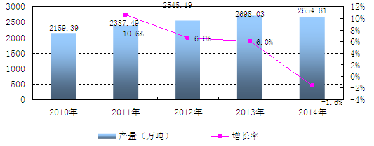 2014年中國乳制品產(chǎn)量達(dá)2651萬噸,比去年同期下降1.7%。2010年到2013年我國乳制品一直增產(chǎn),增產(chǎn)率分別為10.6%,6.6%,6.0%。但是2014年產(chǎn)量比2013年下降了1.7%。