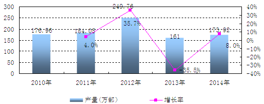 2014年我國傳真機產量173.92萬臺,比2013年同比增長8%。據上圖5年數據分析可知,我國傳真機產量整體呈現比較明顯的波動。從2010年到2012年,傳真機產量呈上升趨勢,2012年以后又開始逐步下降,2012年其產量達到最高點。