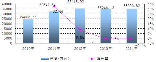 圖表:2009-2014年中國臺(tái)式微型計(jì)算機(jī)產(chǎn)量及其增速走勢圖