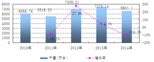 2014年我國(guó)打印機(jī)產(chǎn)量6601.1萬(wàn)臺(tái),比2013年同比下降10.5%。我國(guó)打印機(jī)產(chǎn)量整體有明顯波動(dòng)變化。從2011年至2013年產(chǎn)量一直處于上升趨勢(shì),其中在2013年產(chǎn)量值達(dá)到最高,為7379.14萬(wàn)臺(tái),2012年增速達(dá)到最高,為27.9%,從2013年其產(chǎn)量又明顯下滑,比2013年同比下降10.5%。