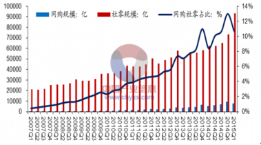 2007-2015年中國網(wǎng)絡(luò)購物規(guī)模及增長率