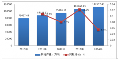 2010-2014年中國鋼材產(chǎn)量增長趨勢圖