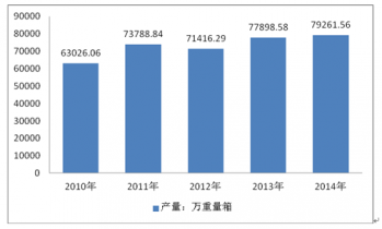 2013年,我國玻璃行業(yè)產(chǎn)能擴(kuò)張迅猛,產(chǎn)量出現(xiàn)大幅增長。2014年全年平板玻璃產(chǎn)量79261.56萬重量箱,同比增長1.09%。